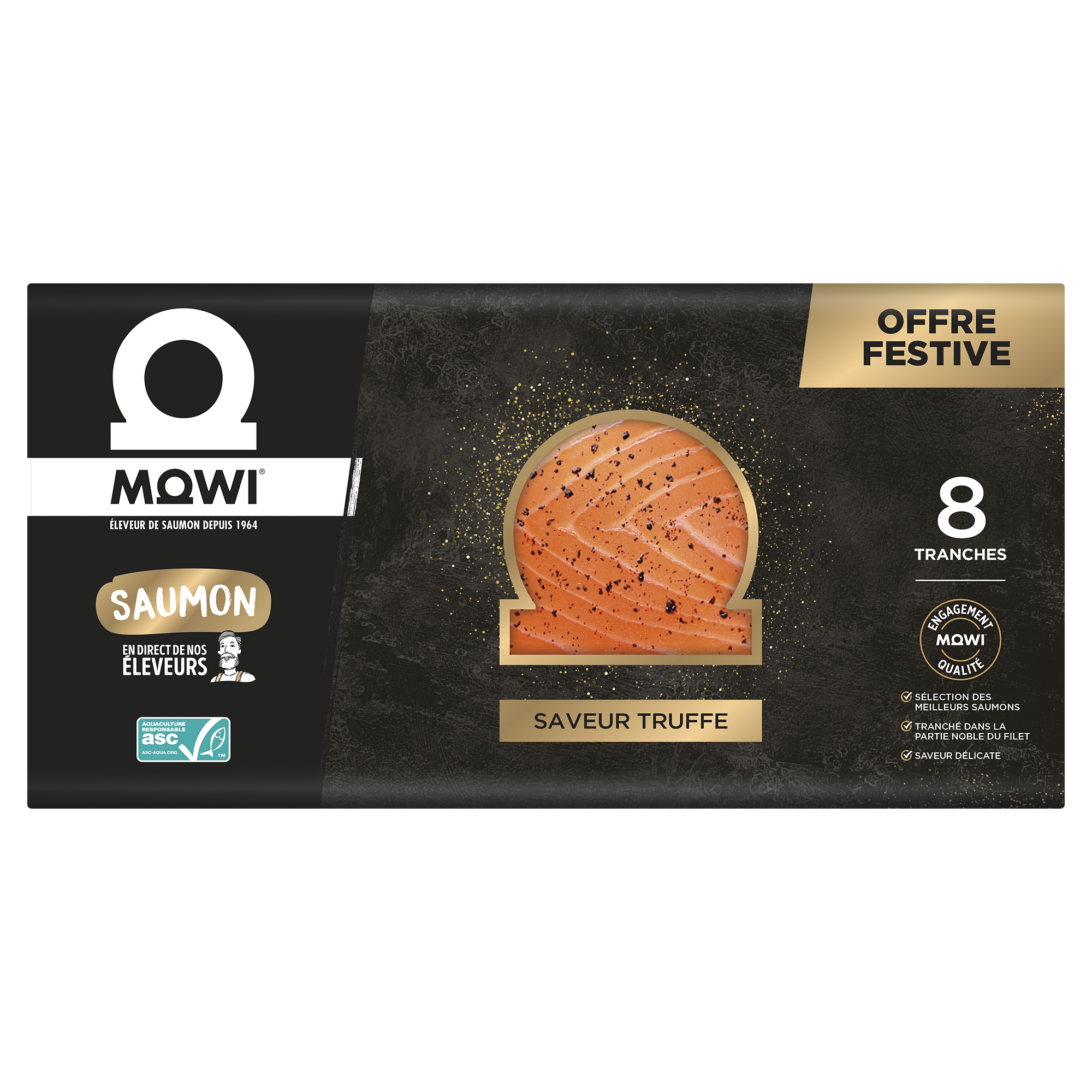 Mélangez maintenant vos pâtes avec la crème. Faites un joli topping avec des copeaux de truffe fraiche et le saumon fumé MOWI saveur Truffe.